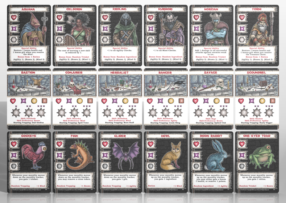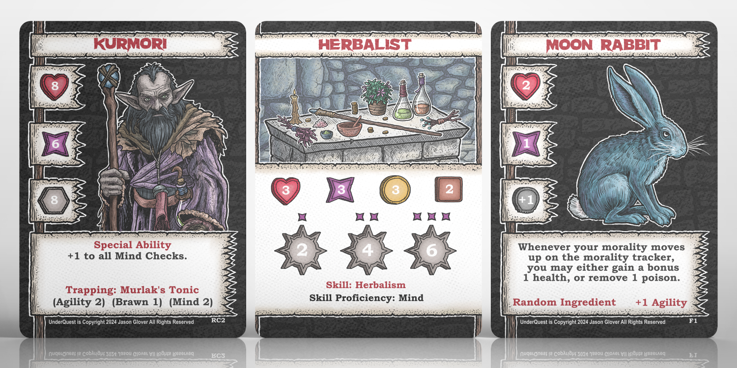 Let’s take a look at the character we have build above, the Kurmori Herbalist, with a Moon Rabbit familiar. Each of the 3 cards help to determine your starting/max health (heart icon). 8+3+2= 13 starting/max health. Also you can figure your starting/max grit (purple star icon). 6+3+1= 10 starting max grit. Grit is similar to energy in my other designs. Now we shall look at each card individually to see how they make your character come to life.