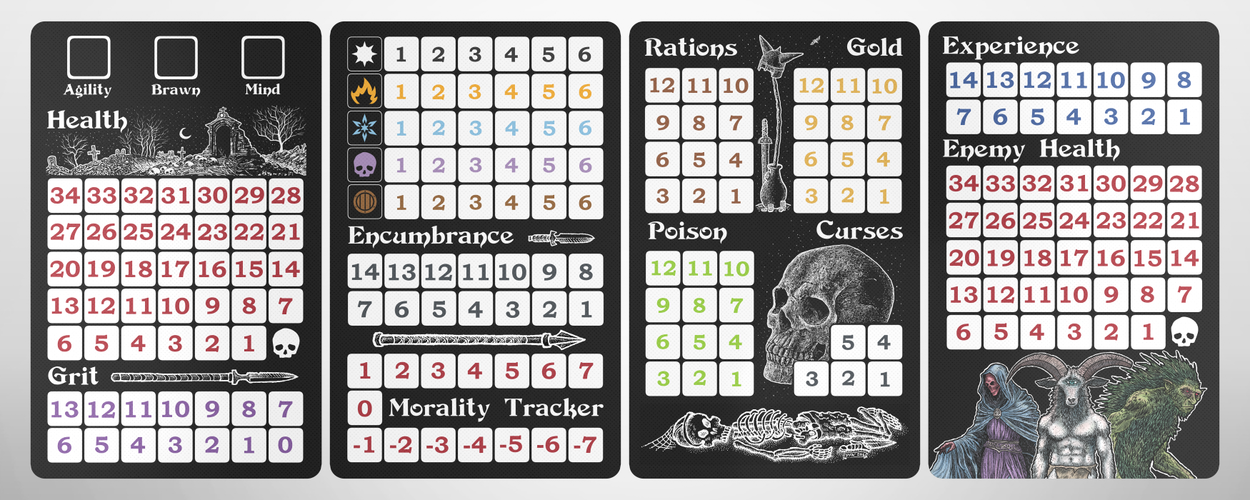 We also got rid of the smaller tracker cards and replaced them with larger ones which also now include a way to track your encumbrance. Doing this is what also freed up 7 poker-sized cards for the five new cards above and two more that we will dive into next. Here is a look at the 4 jumbo tracking cards. Also included now will be 3 blue dice for keeping track of your stats of Agility, Brawn, and Mind.