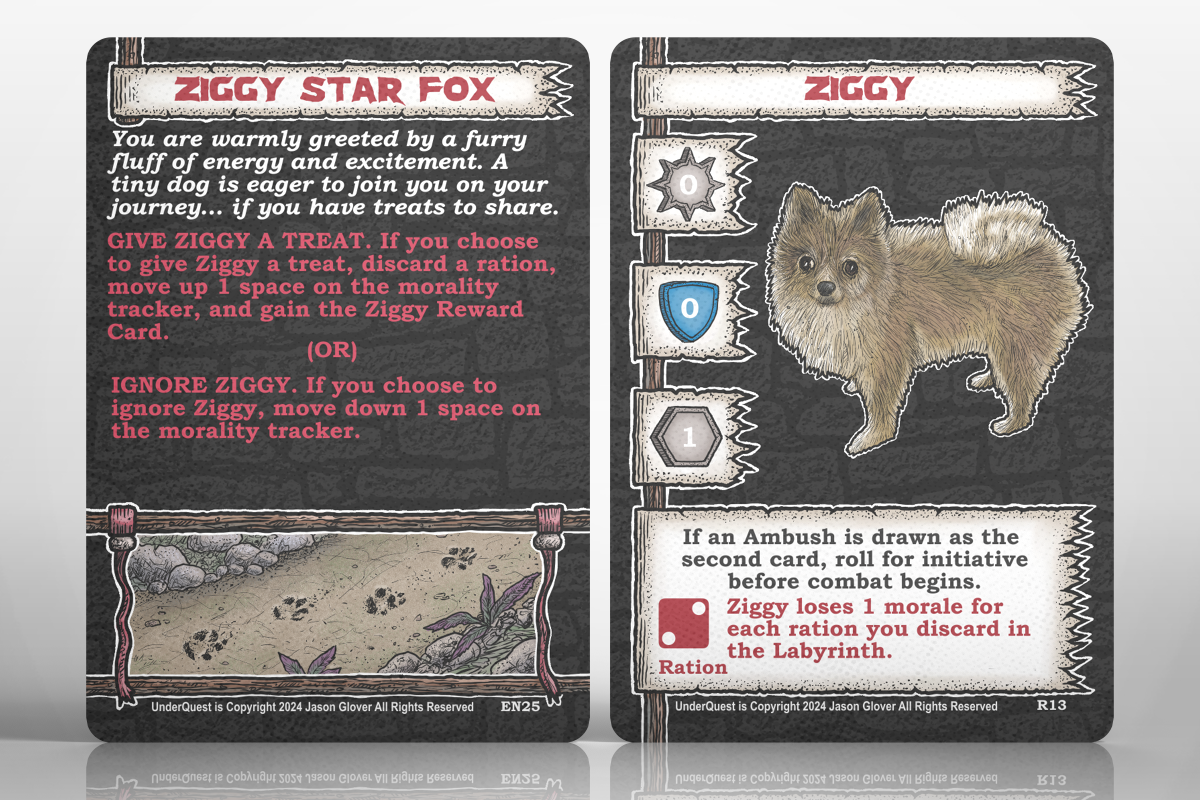 With the final two cards I decided to tip my hat to Dustin for his hard work and we added a Ziggy companion reward card and an encounter card that introduces him. Ziggy is a faithful companion that will warn you of an ambush.