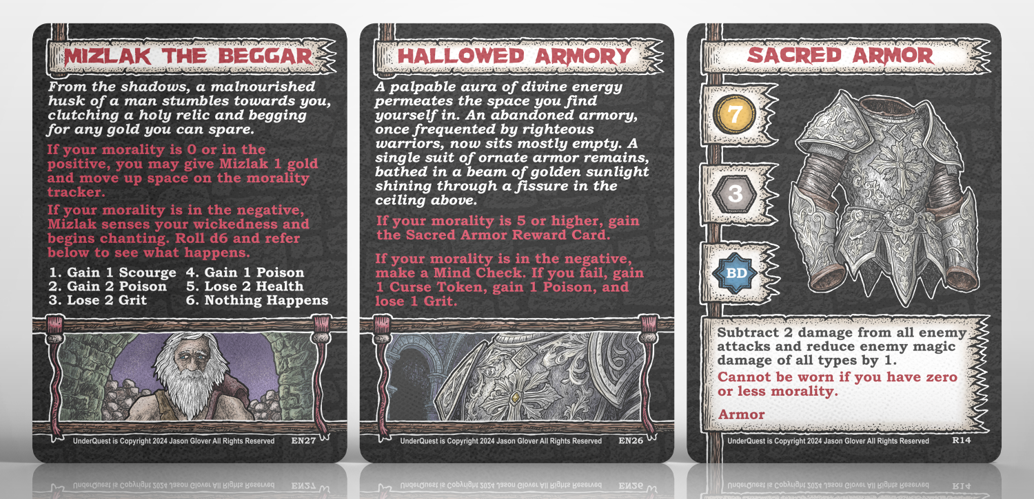 MORALITY SYSTEM. The morality system in UnderQuest was certainly better than it was in Iron Helm, but it wasn’t perfect. Often making the evil choice was better in the long run. We made some changes there by altering a few cards and adding some new cards like the ones below. Having negative morality will now haunt you more than before, while making good choices can lead to some great rewards. That was always the goal. Being evil helps you in the present, and being good potentially pays off in the end. Kind of like real life.